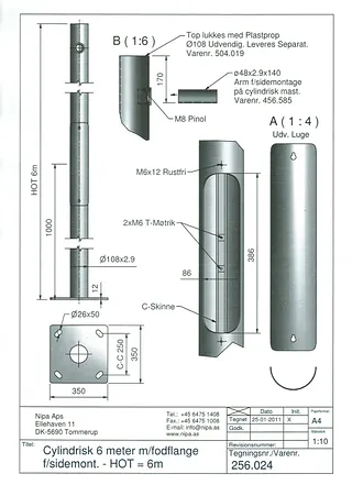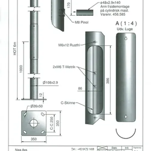 Masterne produceres med en diameter på Ø108 mm med sidestuds for montering af specialarm, der danner envinkel på 90 grader med masten,