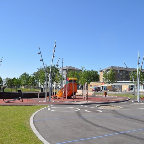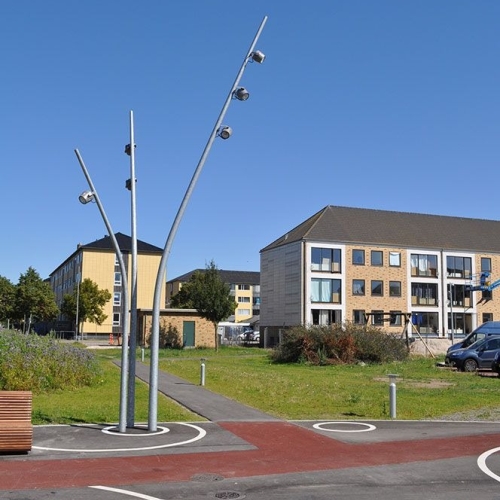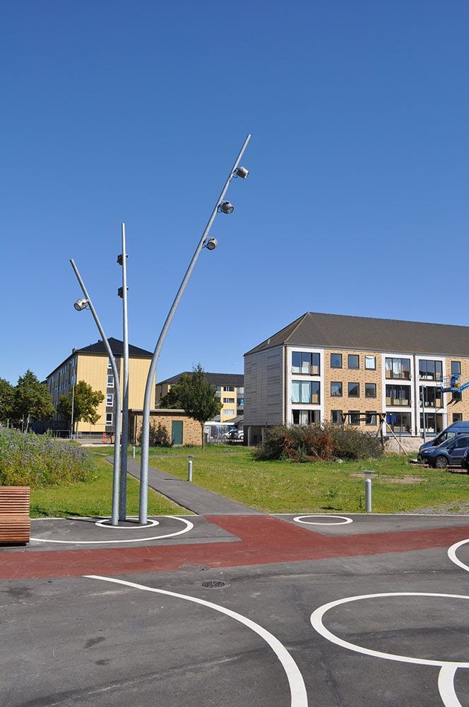 Boligområde med bukkede, galvaniserede og koniske master der opleves både som en dekoration og en del af legeområdet.